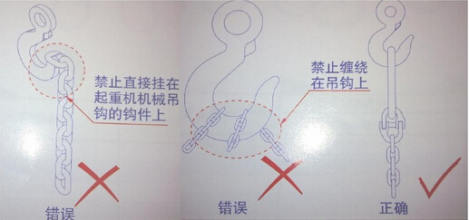 4.承載鏈條索具禁止直接掛在起重機吊鉤的鉤件上或纏繞在吊鉤上。