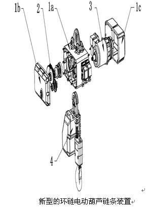 環(huán)鏈電動葫蘆主要由減速器,電機(jī)以及鏈條組成,但是由于對減速器,電機(jī)以及鏈條的布局不合理,導(dǎo)致環(huán)鏈電動葫蘆的體積較大,同時環(huán)鏈電動葫蘆的零部件數(shù)量很多,由于其零部件多為非標(biāo)零件,生產(chǎn)這些零件還需要定制很多的模具,這就不利于零部件的生產(chǎn)管理,也不利于環(huán)鏈電動葫蘆生產(chǎn)過程中風(fēng)險的控制,而且現(xiàn)有技術(shù)中沒有針對繞于鏈輪上的鏈條進(jìn)行很好的保護(hù),往往在上升過程中容易脫鏈,導(dǎo)致環(huán)鏈電動葫蘆的安全性低。