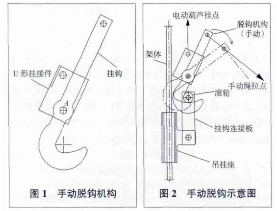 手動脫鉤工作原理。如圖2所示,掛鉤通過滾輪把架體鉤住,電動葫蘆通過U形連接件連接,把架體吊掛在附著處,當掛鉤被人用繩索拉動并繞A點轉動時,掛鉤下部圓弧逐步速脫開滾輪,脫開后架體失去支承而墜落。