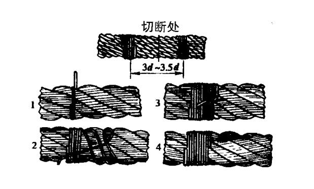 上圖所示為扎結鋼絲位置、順序。對于扎結鋼絲的道數應為:用于麻芯鋼絲繩時為1道;鋼芯時為4道。