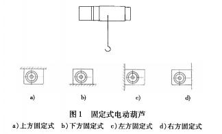 (1)固定式無運行機(jī)構(gòu)、固定使用的電動葫蘆,按其安裝方式不同(即座腳在上、下、左、右位置的不同)可分圖1所示四種類型。