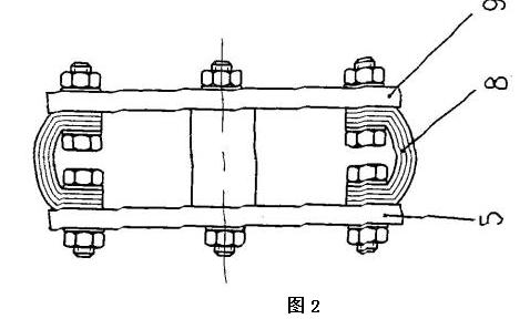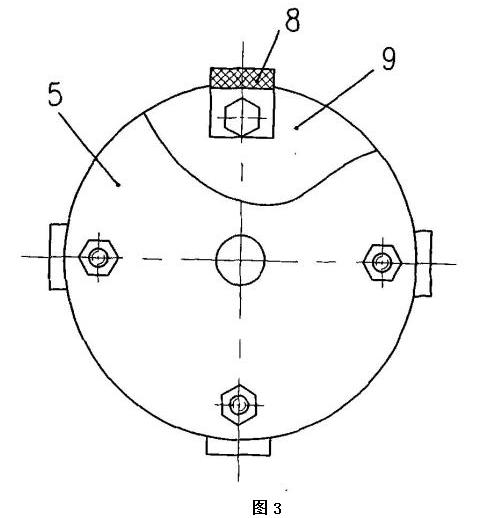該電動葫蘆采用獨特的設計,利用手拉葫蘆和煤電鉆相結合,其手拉葫蘆的手拉轉輪上沒有纏繞搭接手拉鏈,煤電鉆包括機殼和卡裝在煤 電鉆的卡具上的鉆桿,手拉轉輪與鉆桿同軸設置,手拉轉輪朝外的端面朝向煤電鉆,殼體和機殼采用固定架固定相連,手拉轉輪朝外的端面上固定有手拉轉輪法蘭盤,手拉轉輪法蘭盤上均布有多個螺栓孔,每個螺栓孔處采用緊固件分別與一個皮帶條的一端固定相連,每個皮帶條的另一端通過鉆桿法蘭盤上的螺栓孔采用緊固件連接固定在鉆桿法蘭盤上,鉆桿法蘭盤上的螺栓孔位置與手拉轉輪法蘭盤上的螺栓孔位置對應,鉆桿法蘭盤安裝固定在鉆桿的端頭上。在使用時,當需要起吊重物時,可利用煤電鉆的電機帶動鉆桿按照需要的方向旋轉,鉆桿就會通過鉆桿法蘭盤、多個皮帶條8和手拉轉輪法蘭盤帶動手拉葫蘆的手拉轉輪按照需要的方向轉動,從而完成對重物的起吊。由于采用皮帶條這種軟連接設計將煤電鉆的電機產生的扭矩傳遞到手拉葫蘆的手拉轉輪,保證了手拉葫蘆轉動的平穩性,再由于煤電鉆的輸出轉速較低,不需要另加減速裝置,故本發明的利用手拉葫蘆和煤電鉆改造成的電動葫蘆的結構非常緊湊,體積也較小,尤其適宜井下機電硐室起吊、裝卸設備和物件、以及安撤面使用,并可降低工人勞動強度,提高工作效率。