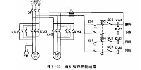 主電路用斷路器QF作短路保護,接觸器KM1、KM2控制提升電動機M1,KM3、KM4控制行進電動機M2的正反向運行,它們都是靠改變施加于電動機三相電源的相序,實現正轉或反轉的,YB為電磁制動器,它裝在提升電動機M1的端部,以保證吊鉤的準確定位。