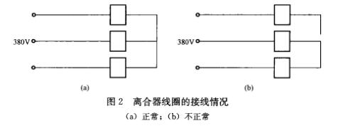 從圖2(a)可以看出,正常的情況下,3個線圈的電壓都是220V,3個線圈都能正常地吸合,離合器也能正常的離合,上升和下降時電動機能正常地工作,但在有一個線圈的一端脫離中點后,中點就不存在了,見圖2(b)。3個線圈中,一個線圈沒有電壓,另兩個線圈的電壓為380/2V=190V,每個線圈雖說有190V,但這兩個線圈是串聯的,不能保證兩個線圈的阻抗是相等的,這時3個線圈都不可能正常地工作,造成了離合器不能正常地勤離合。離合器的工作不正常,就造成了電動葫蘆上升和下降時的阻力增大,電動機就不能正常的工作工作,電動葫蘆就不可能正常的上升和下降了。