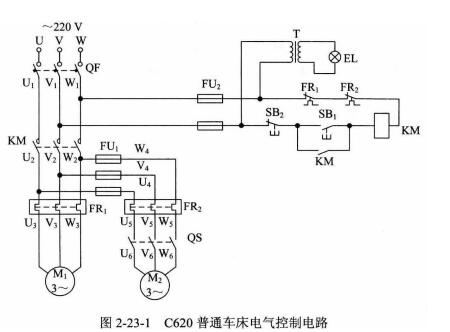 C620普通車床電氣控制電爐如圖2-23-1所示,M1,M2為容量小于10kw的電動機,采用全壓直接起動,均為單方向旋轉。M1由接觸器KM實現起動、停止控制,M2由轉換開關QS控制。M1、M2分別由熱繼電器FR1、FR2實現電動機長期過載保護,由熔斷器FU1、FU2實現M2電動及、控制電爐及照明電爐的短路保護。照明電爐由變壓器T供給電壓,控制照明燈