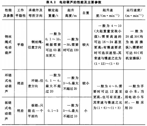 電動葫蘆有鋼絲繩式、環鏈式和板鏈式三種形式。電動葫蘆的性能及主要參數表如表8.2所示。