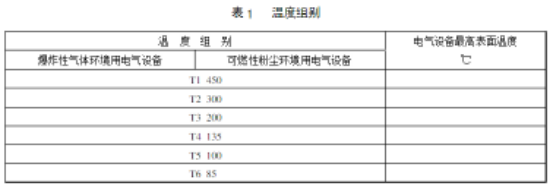 II類和粉塵類防爆葫蘆電氣設備的極限溫度分組,見表1。