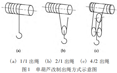 單葫蘆改制適用于 1 /1、2 /1 和4 /2 等出繩方式。單葫蘆改制方案適合于1 ~ 5 t 小起重量的電動葫蘆。該種改制方法相對比較簡單,主要是利用較大噸位的葫蘆進行倍率變換使用。