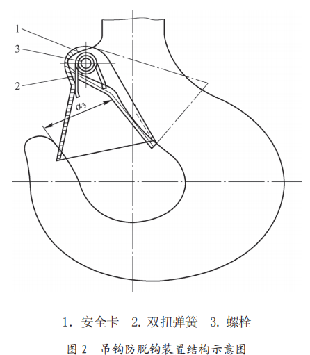 吊鉤防脫鉤裝置:該吊鉤防脫鉤裝置為卡片式結構,該裝置由安全卡、雙扭彈簧、螺栓組成,如圖2所示。經現場檢查,事發后安全卡處于吊鉤開口以外非正常工作位置。安全卡長110mm,款39mm,安全卡無明顯變形,雙扭彈簧功能有效,螺栓緊固完好。通過將安全卡恢復到正常工作位置后手動測試,安全卡動作復位靈活,防脫鉤裝置具備正常防脫鉤功能。