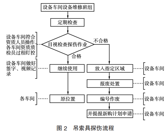 由設(shè)備車間定期進行檢查檢測,經(jīng)過探傷后合格的吊索具交由原車間繼續(xù)使用,并做好相關(guān)視頻和紙質(zhì)記錄;對檢測不合格的,要放入指定區(qū)域,集中報廢處置并做好記錄,同時啟動新購流程。