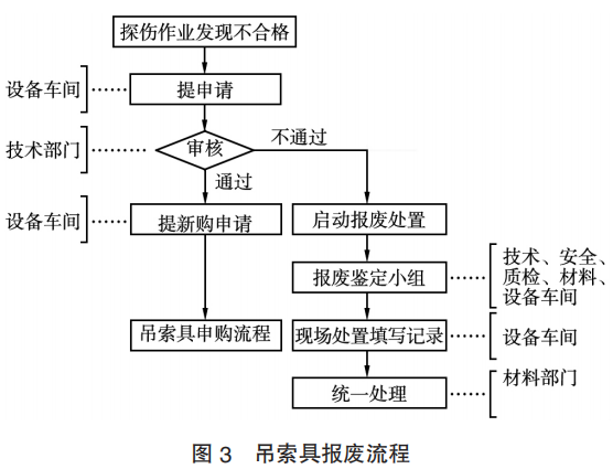 當(dāng)探傷發(fā)現(xiàn)有不合格吊索具時(shí),由設(shè)備車間提報(bào)報(bào)廢申請(qǐng),報(bào)技術(shù)部門審核,通過(guò)后設(shè)備車間組織報(bào)廢鑒定小組進(jìn)行現(xiàn)場(chǎng)處置并填寫(xiě)臺(tái)賬記錄,同時(shí)由材料部門處置并新購(gòu)。
