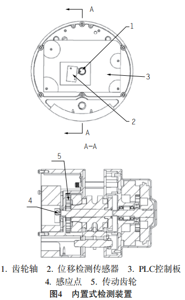 內置式高度檢測裝置如圖4所示,它主要由齒輪軸、位移檢測傳感器和PLC控制板組成。齒輪軸位于電動葫蘆內,齒輪軸貫穿PLC控制板,PLC控制板上設有位移檢測傳感器,位移檢測傳感器位于齒輪軸旁,PLC控制板與位移檢測傳感器電連接,齒輪軸上設有感應點,感應點與位移檢測傳感器配合。根據(jù)不同葫蘆的結構,在葫蘆電機的齒輪軸上,布置一個凸起或凹陷的感應開關感應點用于檢測該軸的轉動圈數(shù)。電動葫蘆必須配置控制的PLC或單片機,用于處理感應開關檢測到軸的轉動圈數(shù)。每臺環(huán)鏈電動葫蘆會根據(jù)實際鏈條長度,預先在程序中設定好鏈條的首位限位點。PLC或單片機程序設定好檢測的軸與起重鏈條運行距離的比例,再根據(jù)檢測軸轉動的圈數(shù)計算出鏈條運行的距離,實時計算出吊鉤的高度,當鏈條運行到限位點時會自動停機,起到限位的作用。