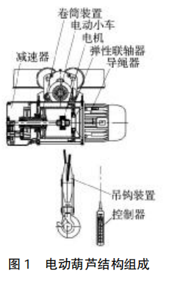 鋼絲繩電動葫蘆又可以分為單速提升型、雙速提升型、微型電動葫蘆、卷揚機、多功能提升機等多種類型。化工廠常用電葫蘆為微型電動葫蘆或懸臂葫蘆,往往在加料或維修車間頻繁進行檢維修作業的固定點位安裝,設備拆裝位置因綜合考慮現場空間安全和建 造成本往往不會安裝電動葫蘆,化工廠常用電動葫蘆結構組成如圖1所示。研究發現,現階段暫未存在同 時具備所需空間小、成本低廉、便 于移動且工作高效的小型起重機 械,也尚未存在對借助外力輔助 手拉葫蘆作業裝置的設計研究。