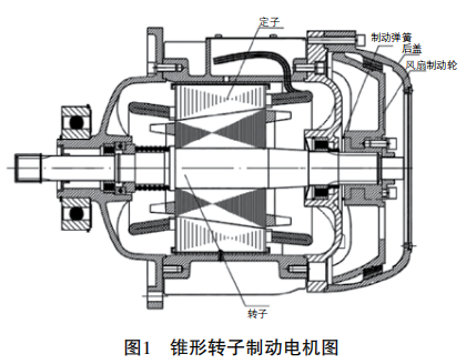 錐形轉(zhuǎn)子制動電機其定子內(nèi)腔和轉(zhuǎn)子外形均為圓錐形,轉(zhuǎn)子的每一個矽鋼片直徑都不相同,制動彈簧只有一根,制動輪和摩擦片均為環(huán)狀的圓錐面結構。