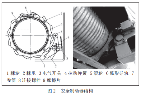 超速保護裝置中提到了安全制動器,其結構型式見圖2。標準規定當起重機額定起重量大于5t時,電動葫蘆除設置一個工作制動器外,還應設置安全制動器,且設置在電動葫蘆的低速級上(當起重機額定起重量小于或等于5t時,也宜在低速級上設置安全制動器,否則電動葫蘆應按1.5倍額定起重量設計),并要求在正常作業時,安全制動器應在高速軸制動器閉合后延時閉合,其延時動作時間可調,進行緊急制動時,安全制動器應立即動作。