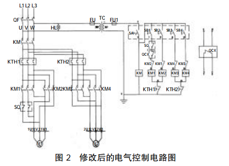 (1)急停開關不能切斷總電源。解決對策:更改原電動葫蘆的控制電路,增加一個能斷開總電源的接觸器。急停開關是帶自鎖的按鈕開關,不能自動復位。實施方案:原控制箱的電器元件已老化,箱體內無法增設接觸器。因此,從長遠考慮,為了保證質量,更換電器控制箱是一個最佳方案。圖 2 為修改后的電氣控制電路圖,KM 是能斷開總電源的接觸器。對于不能更換控制箱的電動葫蘆,必須增加控制電源接觸器。