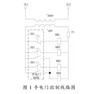 手電門控制電動葫蘆的控制器線路圖如圖1所示,急停開關(guān) SB1 拔起后接觸器 KM1 得電,電動葫蘆動力電上電,SB2 和 SB3 為雙擋按鈕,通過操作按鈕控制電動葫蘆以低速或高速進(jìn)行上升或者下降運(yùn)行,手電門通過移動電纜和牽引繩懸掛在葫蘆下方隨葫蘆水平方向一起運(yùn)行。