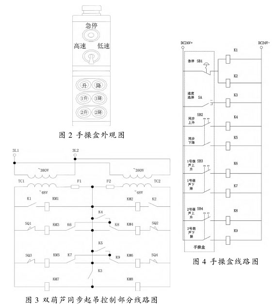 針對環(huán)鏈電動葫蘆的手電門控制和變頻器控制的缺點,在不改變兩臺獨立電動葫蘆機(jī)械結(jié)構(gòu)的情況下可利用改造手電門電路的方式控制兩臺環(huán)鏈電動葫蘆,用以實現(xiàn)雙吊點同步起吊工作,即用一個手操盒控制兩臺葫蘆同步完成上升或下降動作。 對兩臺電動葫蘆的控制進(jìn)行改造,手操盒以及部分電路圖見圖 2—圖 4。
