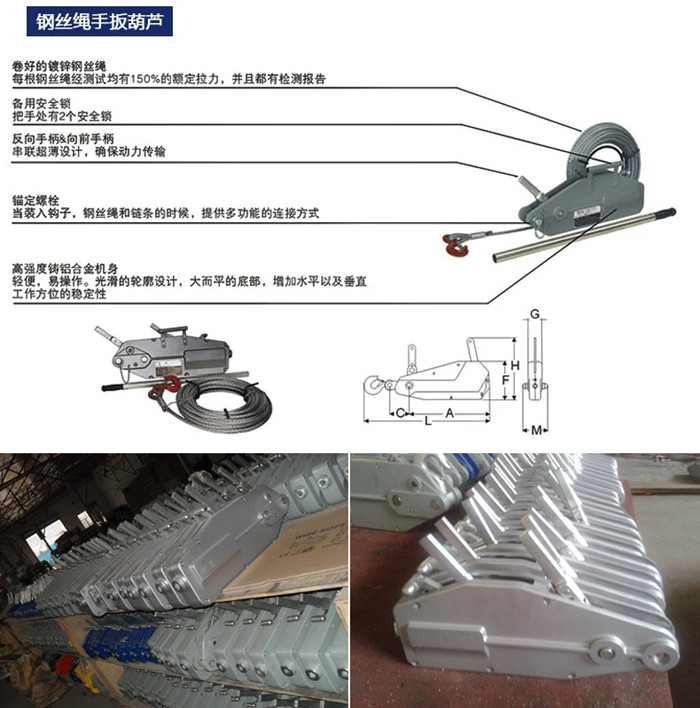 鋼絲繩手扳葫蘆又名鋼絲繩手扳牽引機(jī)。是一種新型、高效、安全、耐用的起重機(jī)械產(chǎn)品,具有起重、牽引、張緊三大功能。
